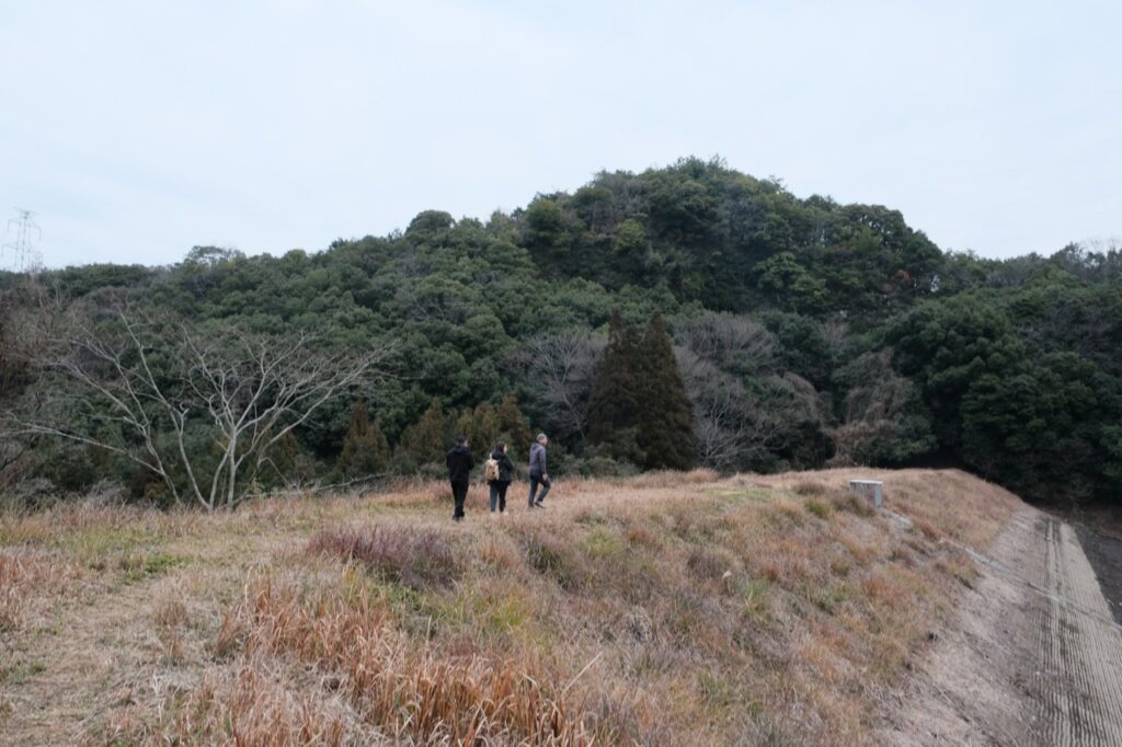 ここから隊員の方の車に同乗し、数分離れたため池付近の空き地に車が停められ、そこから徒歩で猪川内岩屋堂へ向かった。