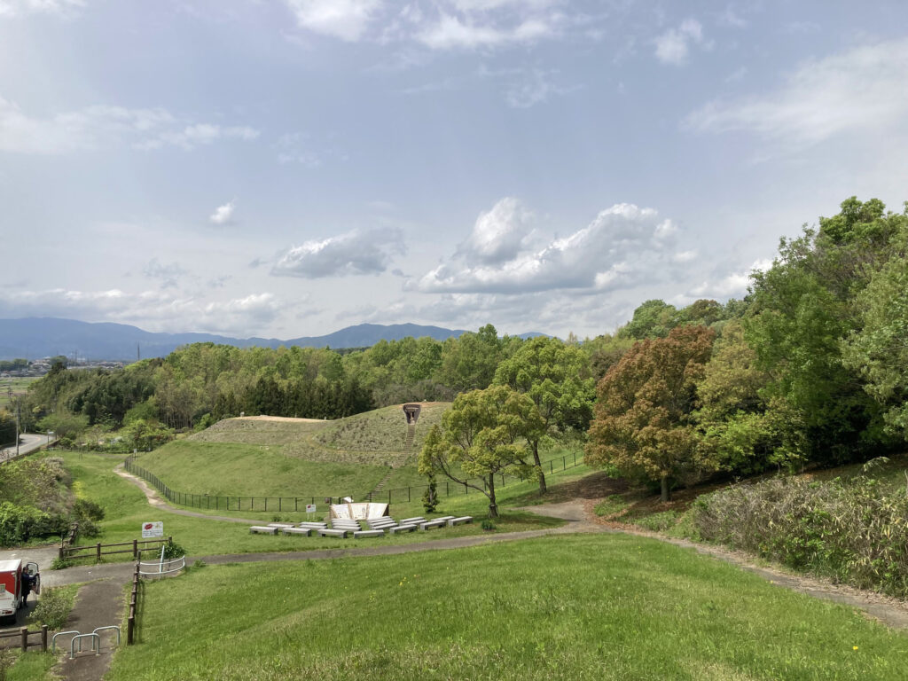 古墳を見下ろす丘から、古墳を眺めていると、古代の人たちはこの景色を見てどんなことを考えていたのだろうと、想像しました。