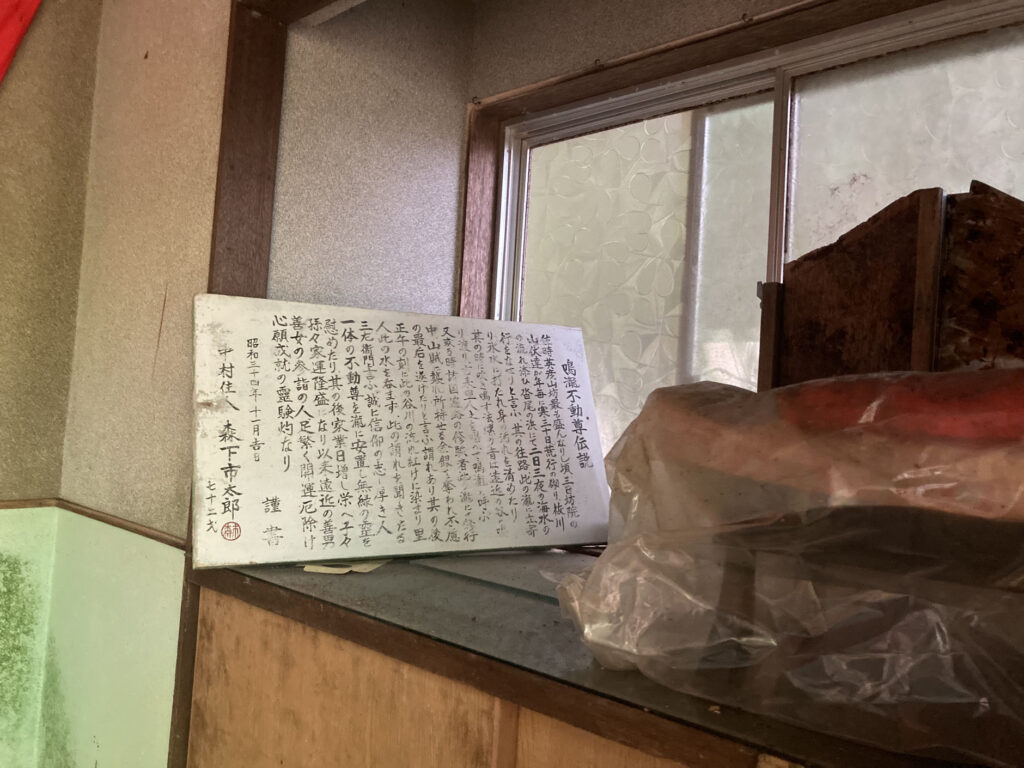 三右衛門と言ふ誠に信仰の志し厚き人 一体の不動尊を瀧に安置し、無縁の霊を慰めたり。