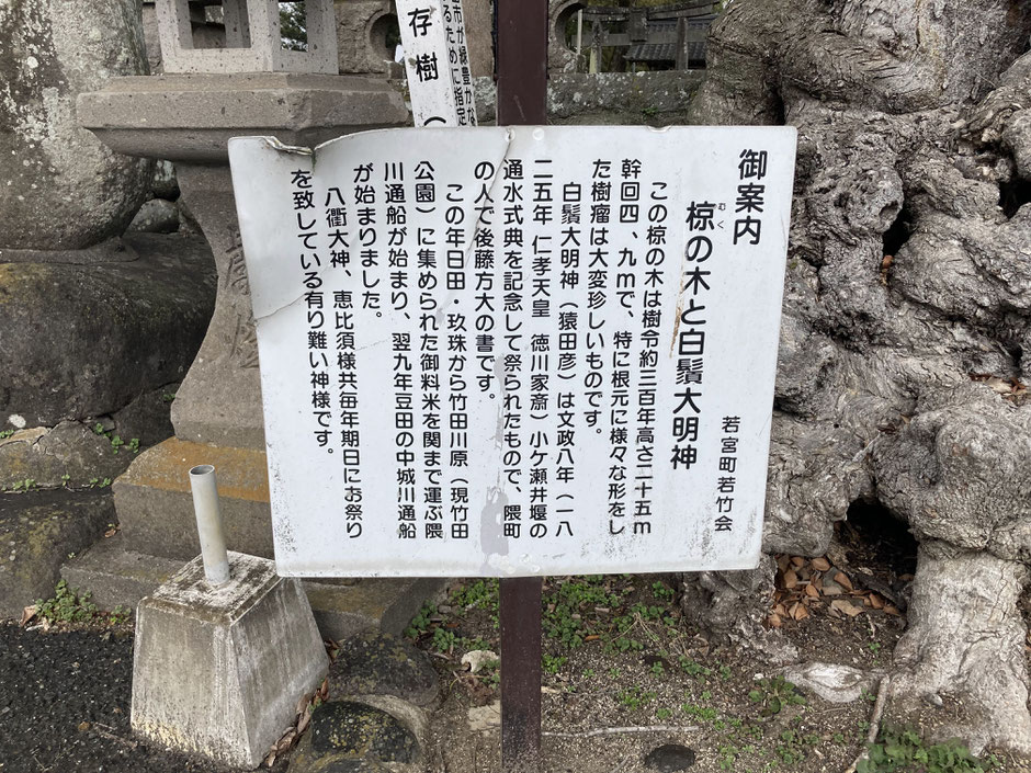 白鬚大明神(猿田彦)は文政八年(一八二五年 仁孝天皇 徳川家康)小ケ瀬井堰の通水式典を記念して祭られたもので、隈町の人で後藤万大の書です。