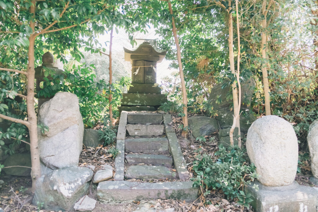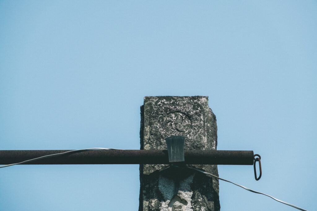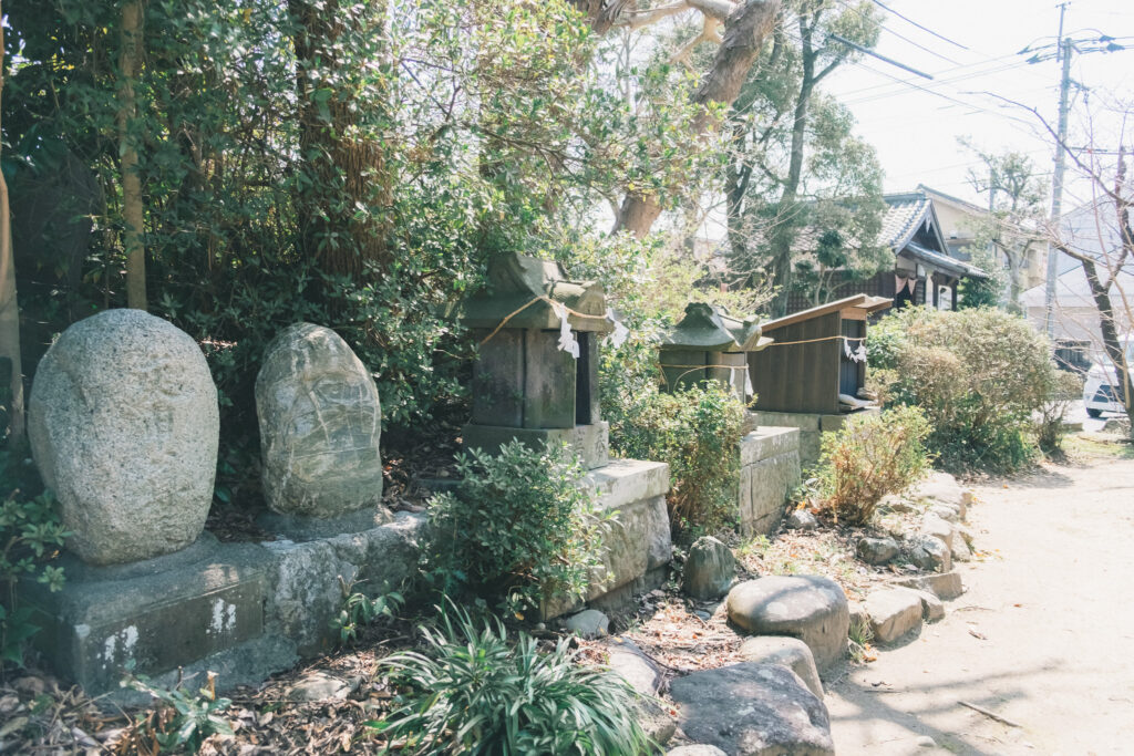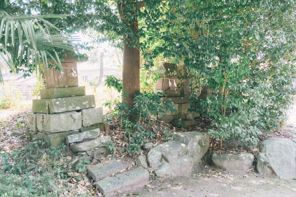 二本の石柱の上部にも、おそらく左三つ巴紋。
