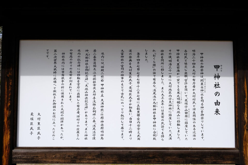 甲神社の御祭神は、罔象女神(みつはのめのかみ)(水を司る神)を御祭りして明治二十四年大村の有力者が大村村民と旧来関係のある各村民と出願、官許を頂いて、荒堀山田原に鎮座していた甲神社を、豊前海が一望できる風光明媚な天地山に移転しました。その後、明治三十一年に大村地区内字天神林に鎮座していた、天満神社を同所に移しました。また大正五年には豊前の民話でも語られ「おくら様」の話で有名な、池尾池の馬鞍神社を甲神社に合祀致しました。